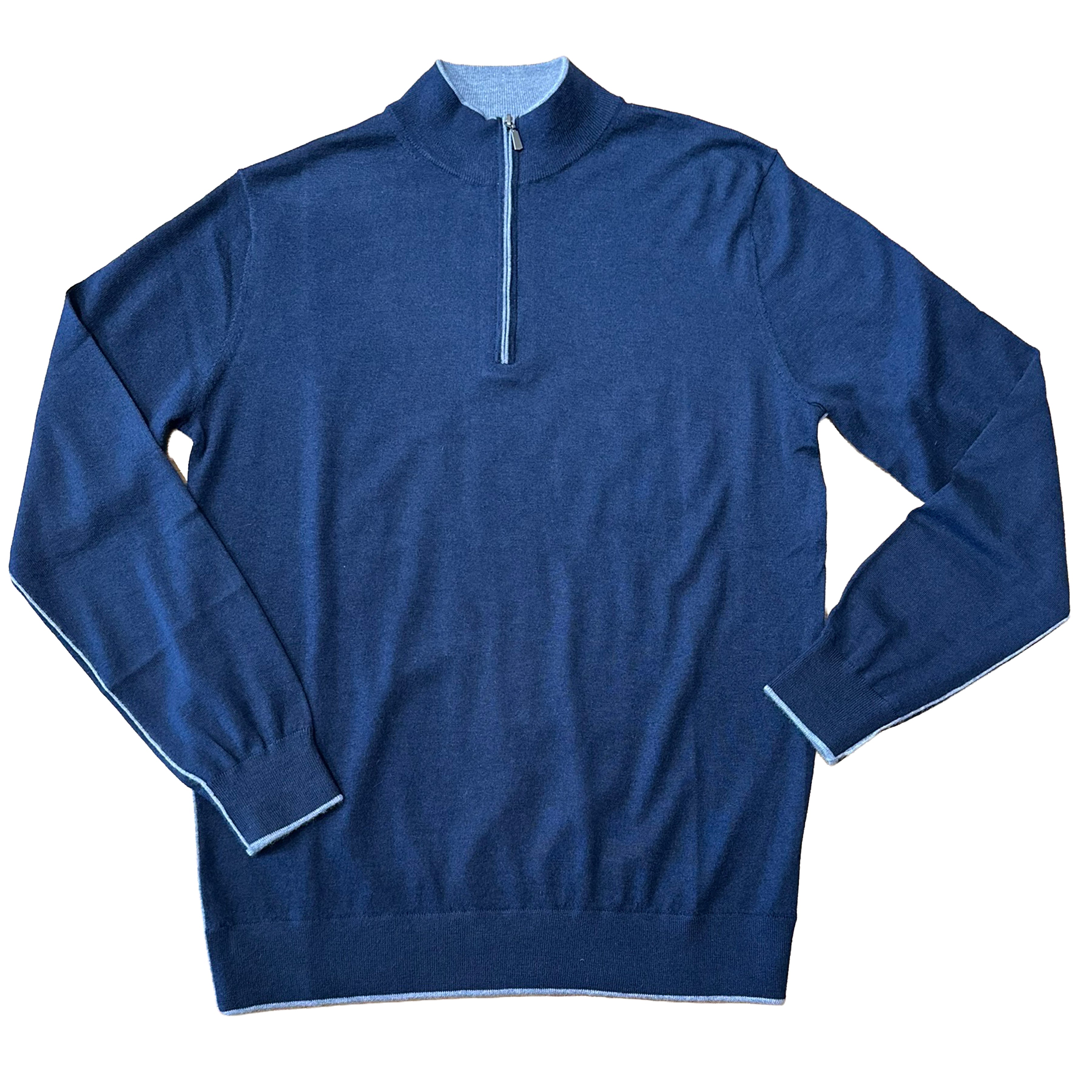 Based on vintage Italian lightweight merino sweaters, the Superfine Cashmere Quarter Zip is crafted from tee-shirt weight cashmere and features a quarter-zip with quarter stand neck trim. Banded cuffs and hem with contrast tipping.