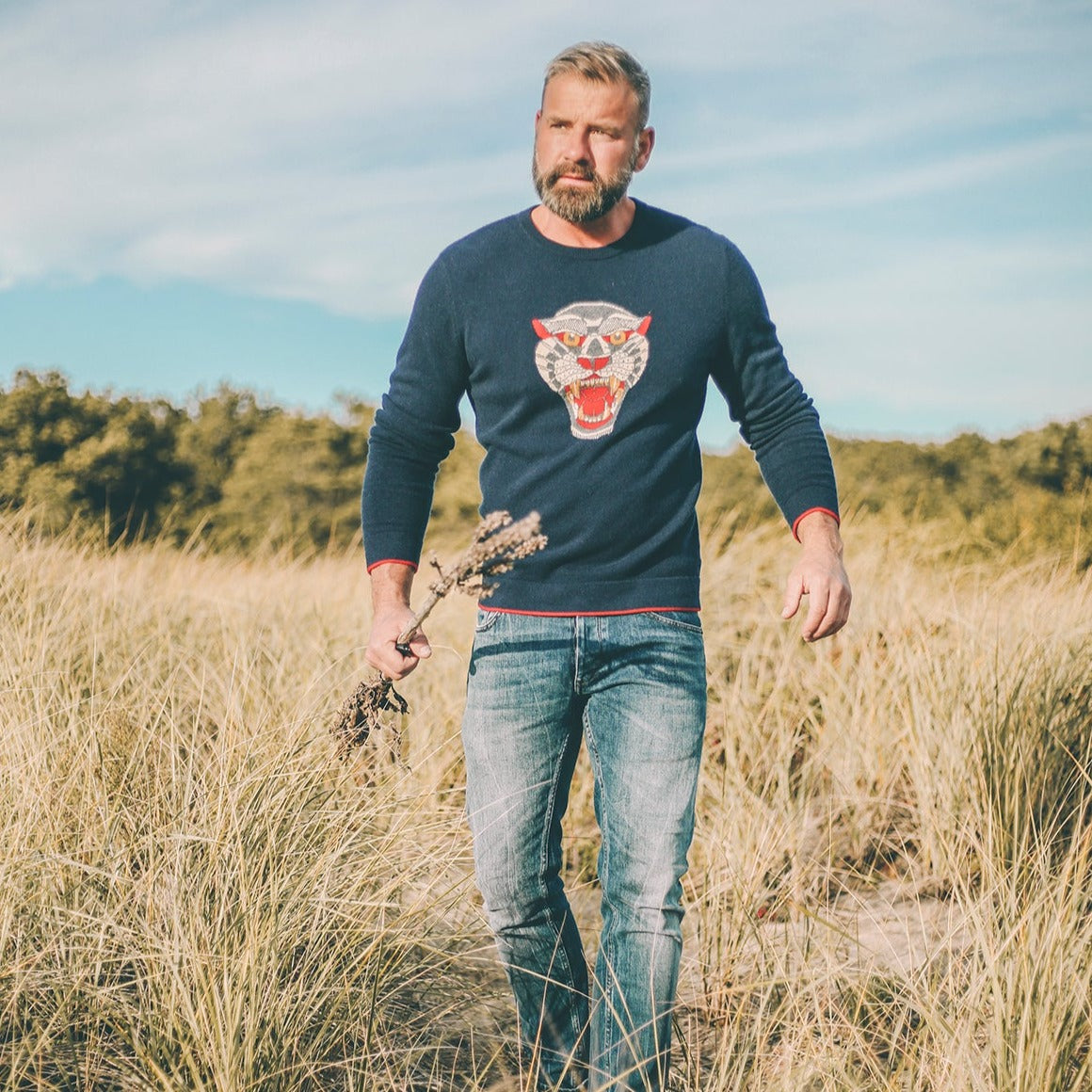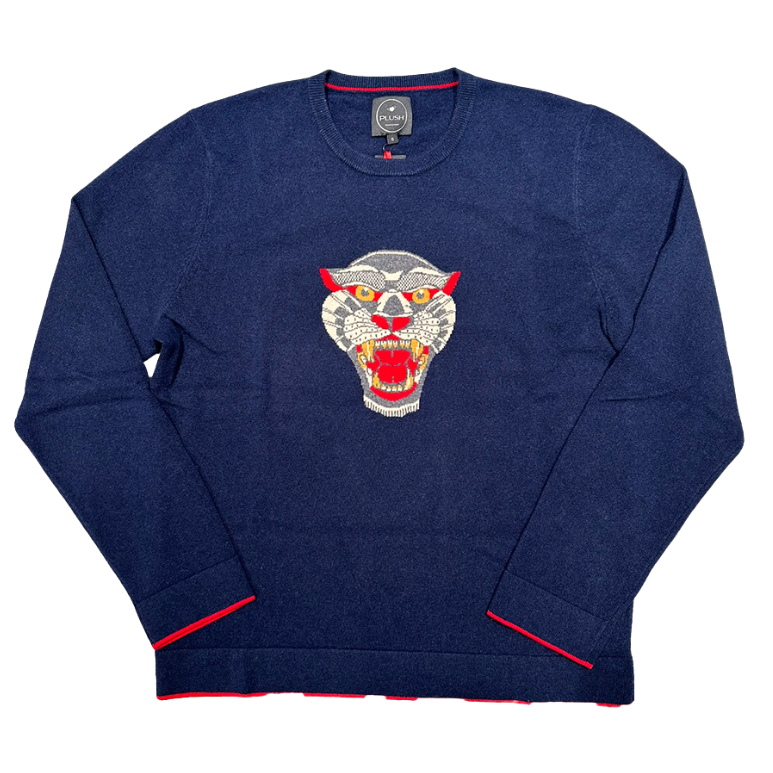 Based on 1940s tattoo art from the South Pacific, the Panther design has been translated into 100% 2-ply cashmere using a full hand-intarsia knit-in technique. It features a deep navy ground with bright red tipping at cuffs and hem.